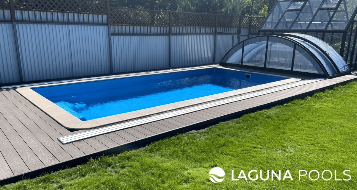 Прямоугольный бассейн с ярко-синей водой окружен серо-коричневой террасной доской и сдвижным павильоном на металлическом каркасе.