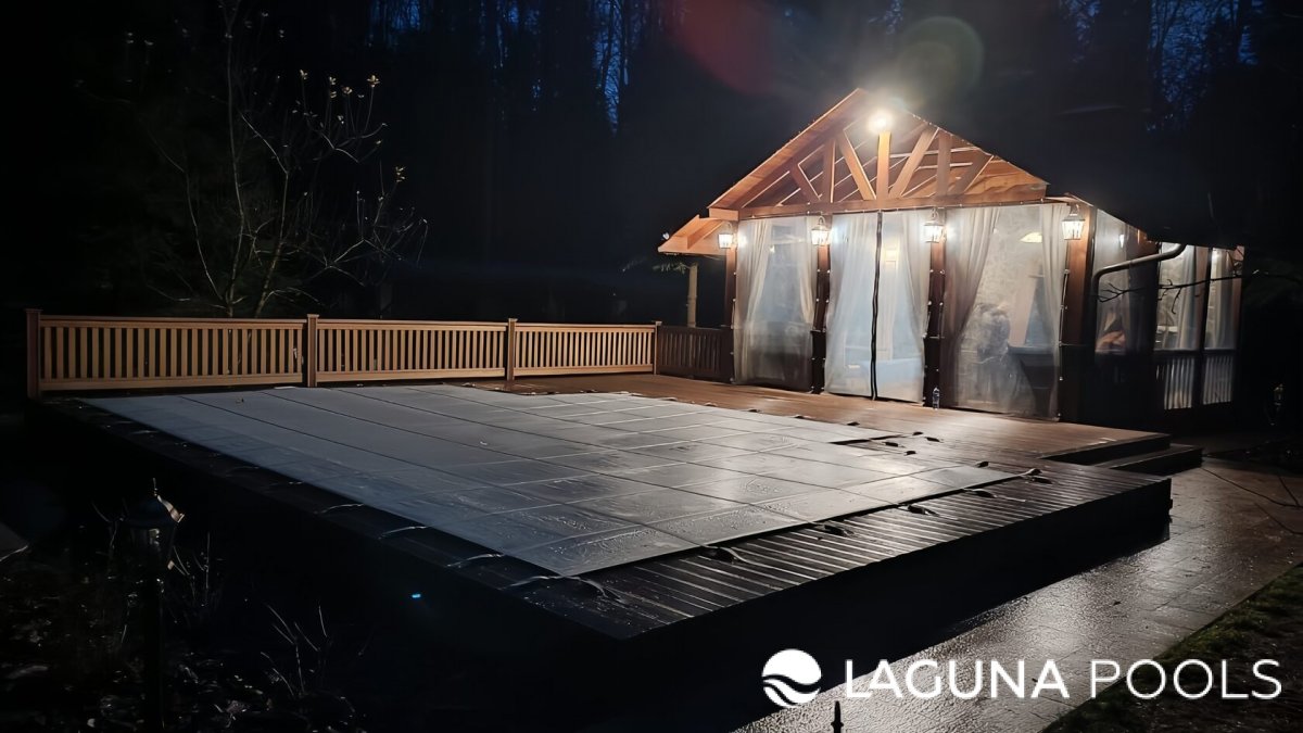 Композитный бассейн с накрывающим тентом на участке с деревянной террасой и беседкой, освещённой тёплым светом.